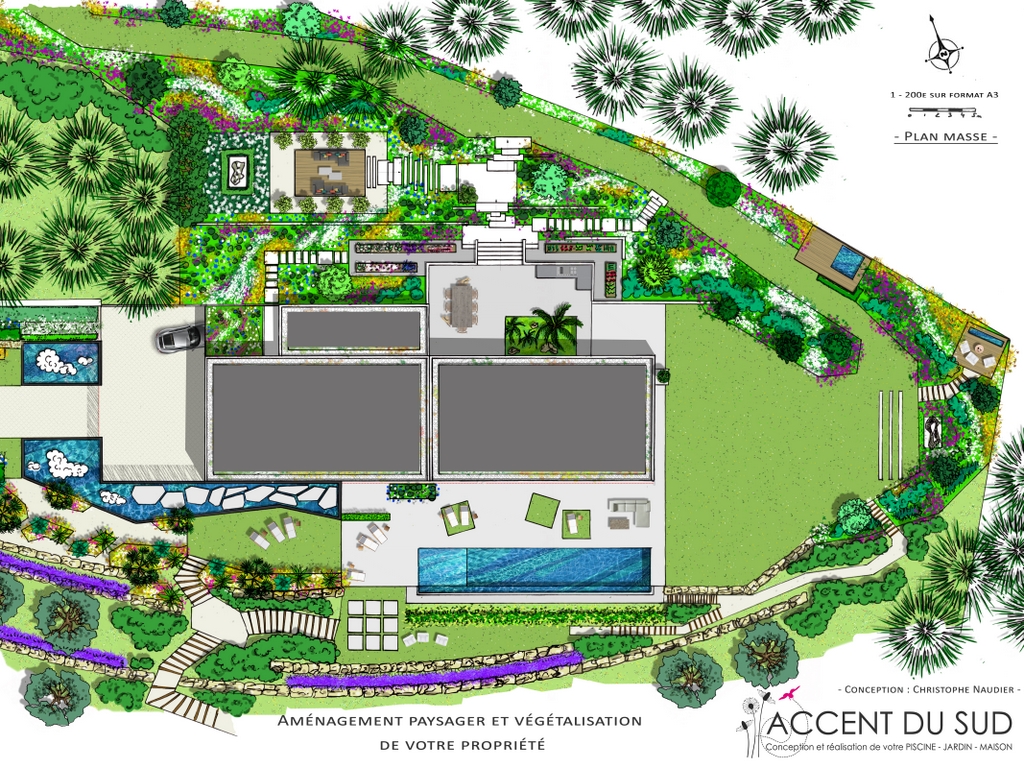 L’entrée de la maison d’architecte offre une vue symétrique sur deux bassins ornés de sculptures qui annoncent le style contemporain de la propriété. La découverte des lieux se poursuit à travers un cheminement composé de dalles à fleur d’eau, avec en second plan des massifs exotiques composés de palmiers, cordylines australes et plantes méditerranéennes (kniphofia, graminées, agapanthes…).