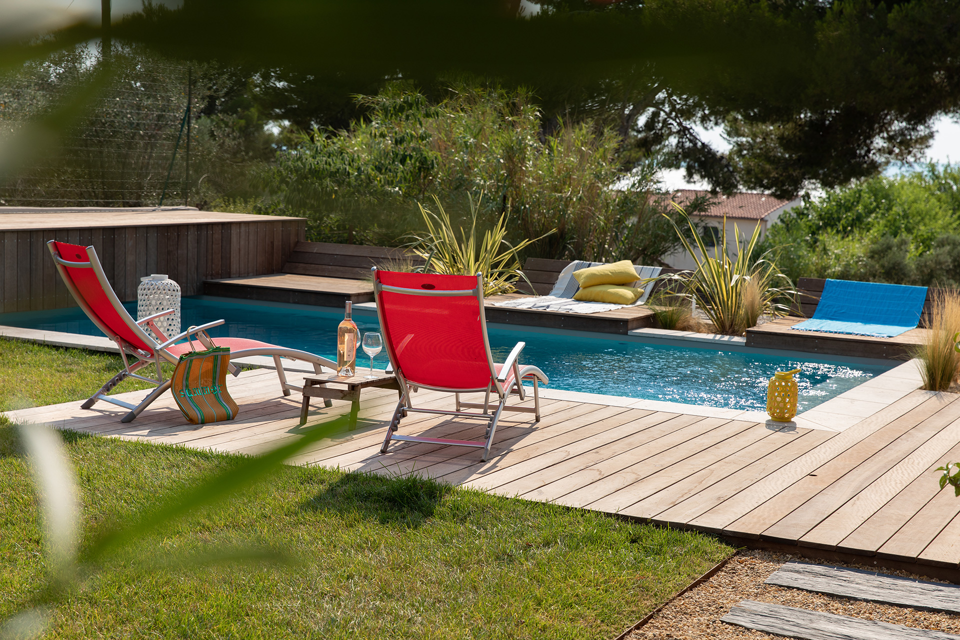 Ici, les propriétaires avaient envie d’un espace banquette en angle pour les soirées apéros au bord de la piscine !